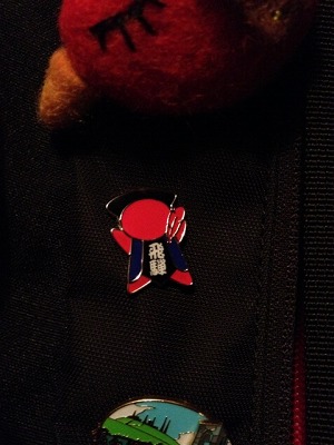 その「さるぼぼ」が赤い羽根を付けているバッチ