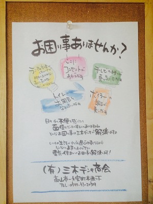 つぶやき 春です お困りごとありませんか? 2015年4月4日 usagi 4件のコメント バタバタっと 三月が過ぎ アッという間に 四月 皆さん お元気ですか 店のまわりの雪もすっかり 溶けて 春 今日なんか 気温が20度を超える予想です 春はいいですね さてさて 春です お困りごとありませんか? アナロテレビが見れないなどなど お問い合わせいただいていますが なんなりと お声をかけてください そうそう チラシを作りましたよ さっそく お客さまへ配りましょう~~